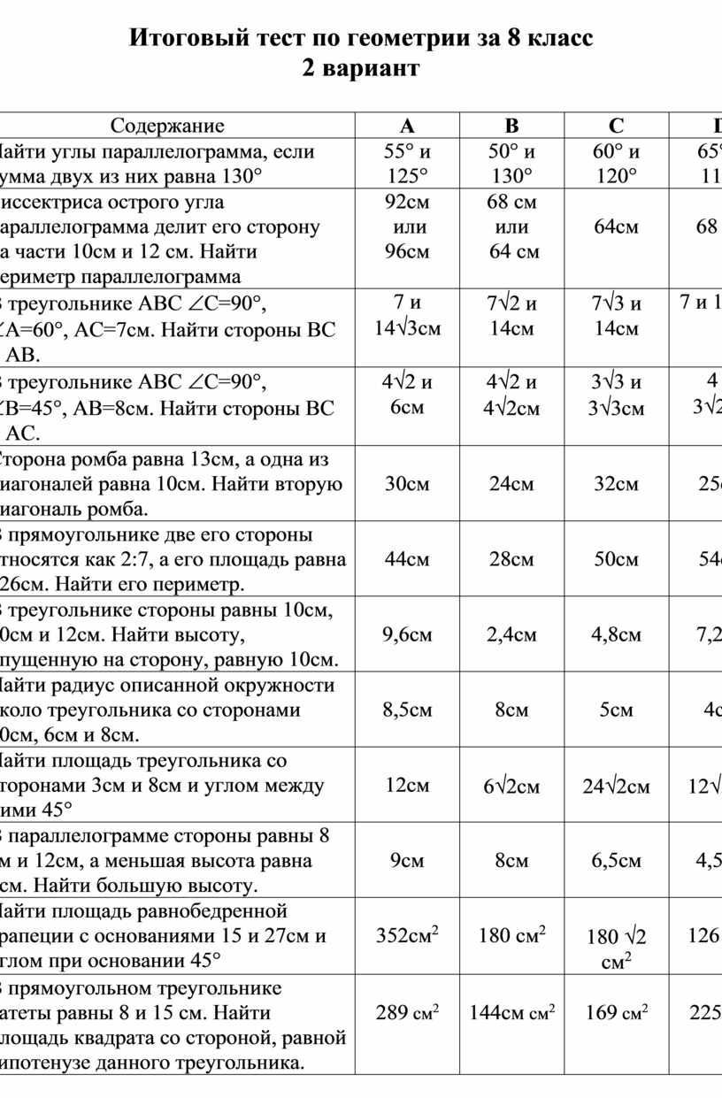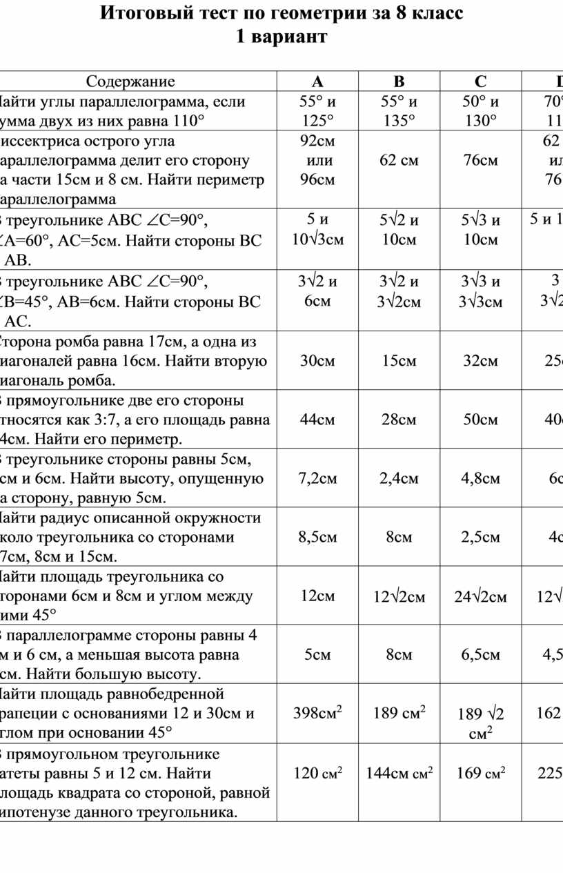 Итоговый тест по геометрии за 8 класс