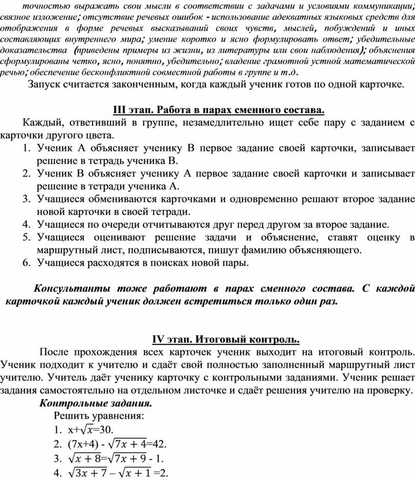 Консультанты тоже работают в парах сменного состава. С каждой карточкой каждый ученик должен встретиться только один раз.