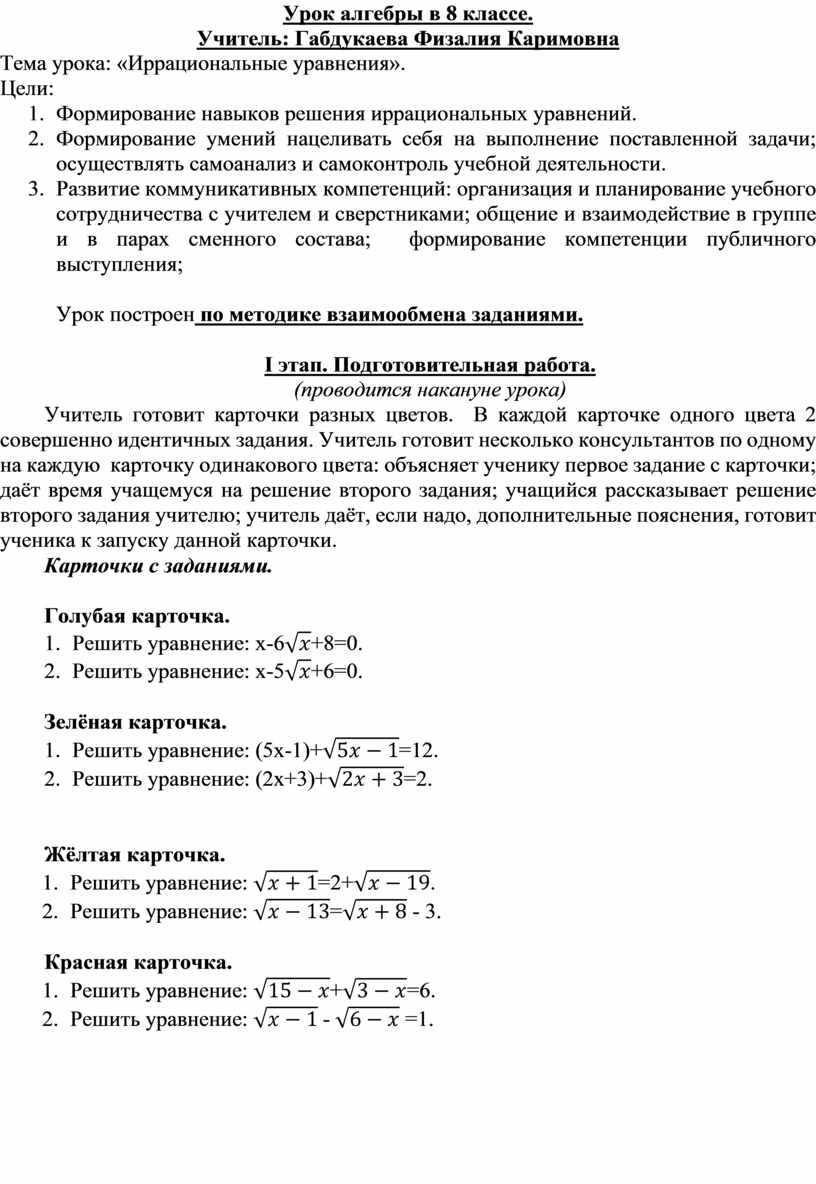 1. Формирование навыков решения иррациональных уравнений.