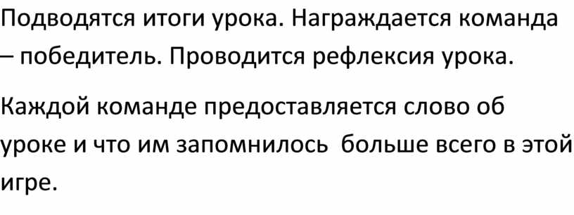 Каждой команде предоставляется слово об уроке и что им запомнилось больше всего в этой игре.