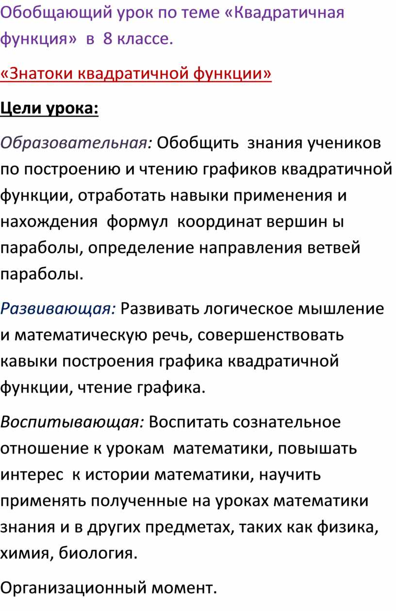 Обобщающий урок по теме «Квадратичная функция» в 8 классе.