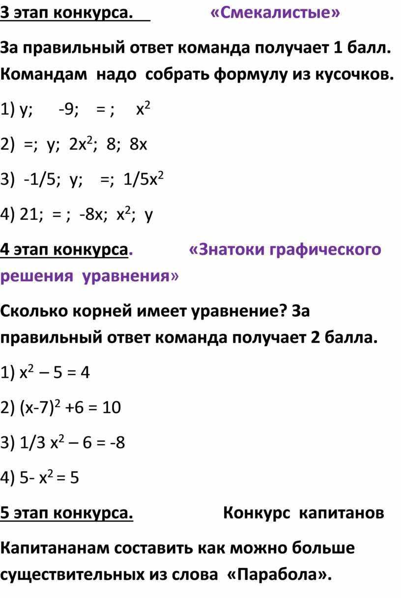 Задаётся формула и график и команде надо установить соответствие между ними. За правильный ответ команда получает 1 балл.