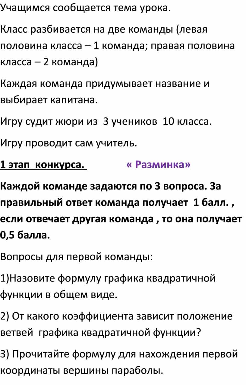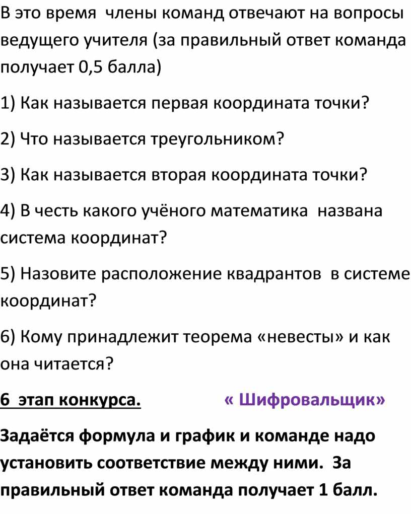 В это время члены команд отвечают на вопросы ведущего учителя (за правильный ответ команда получает 0,5 балла)