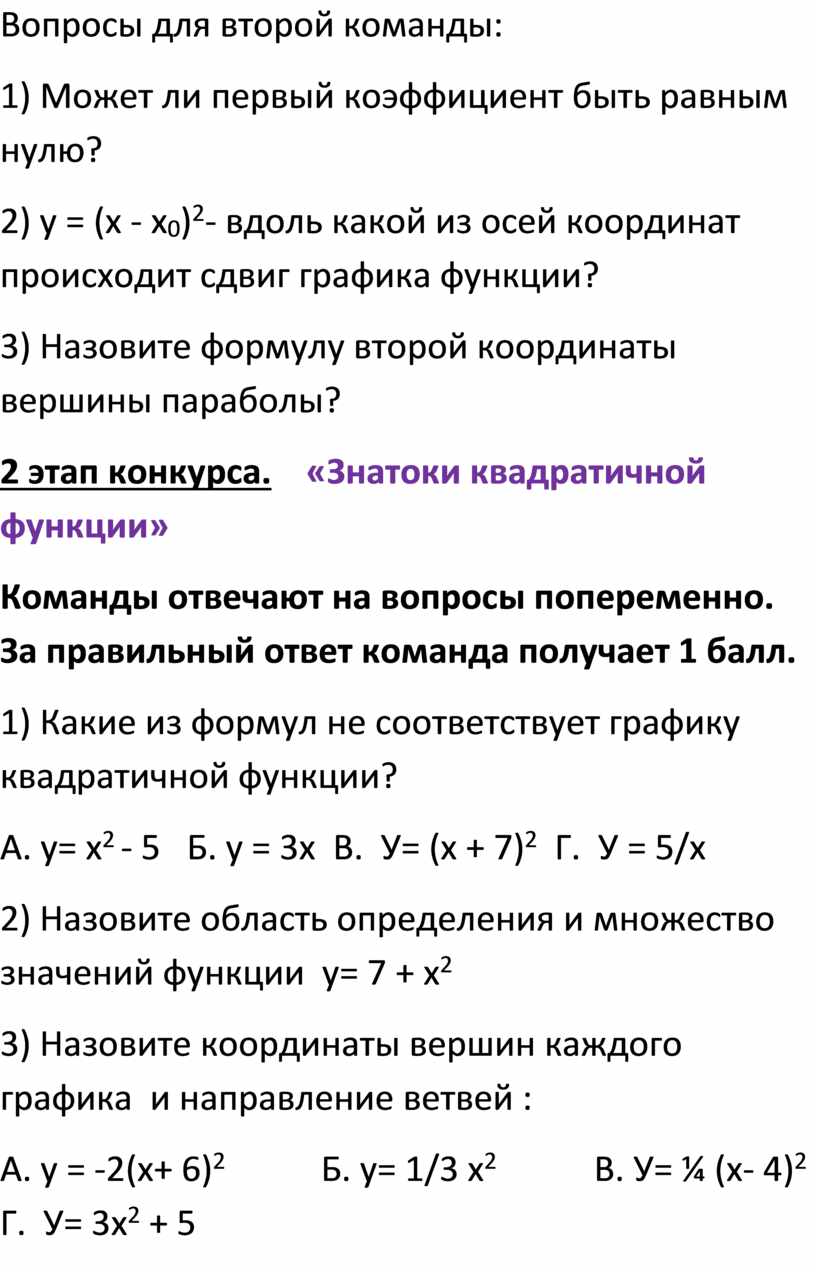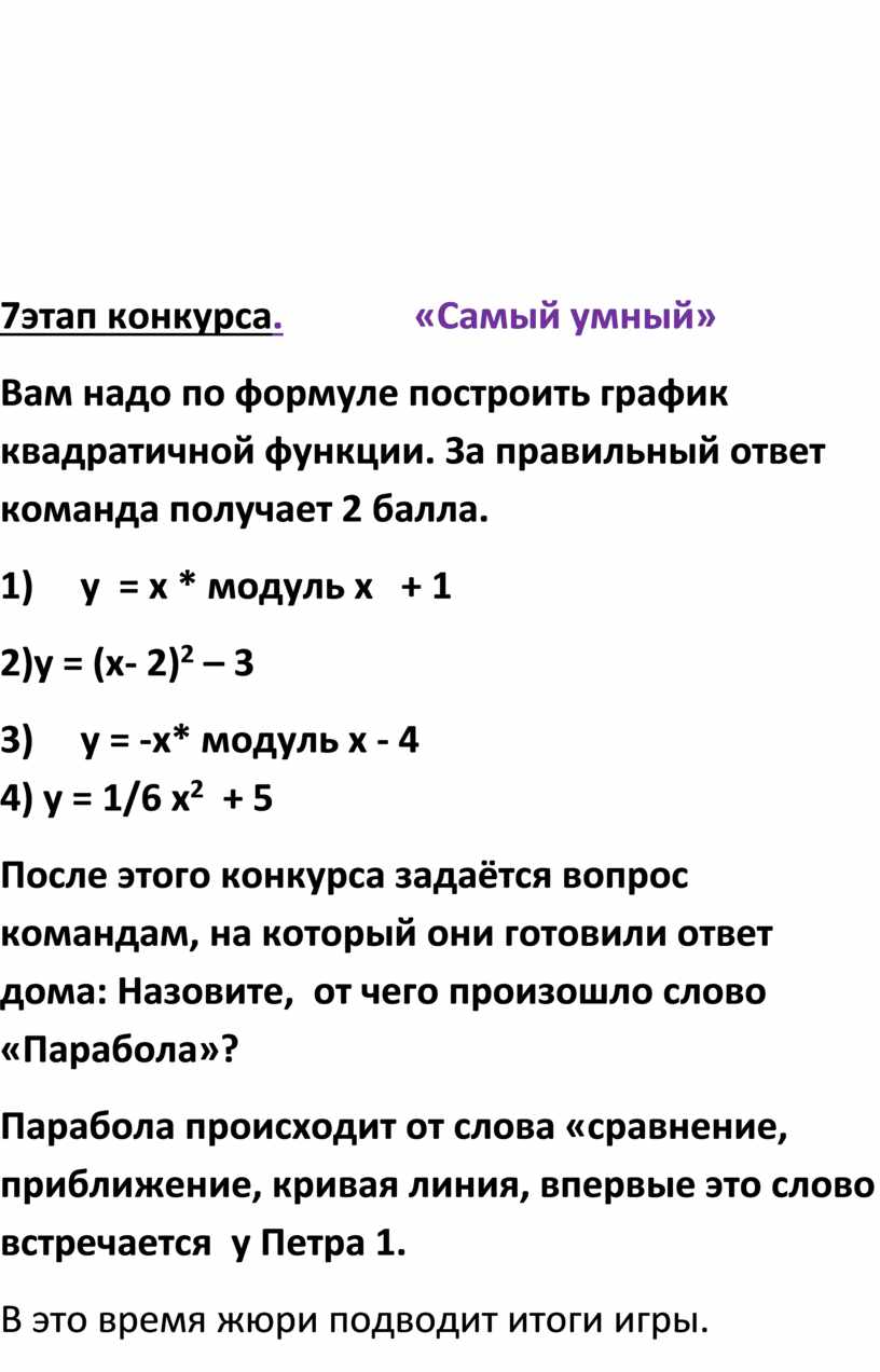 Вам надо по формуле построить график квадратичной функции. За правильный ответ команда получает 2 балла.