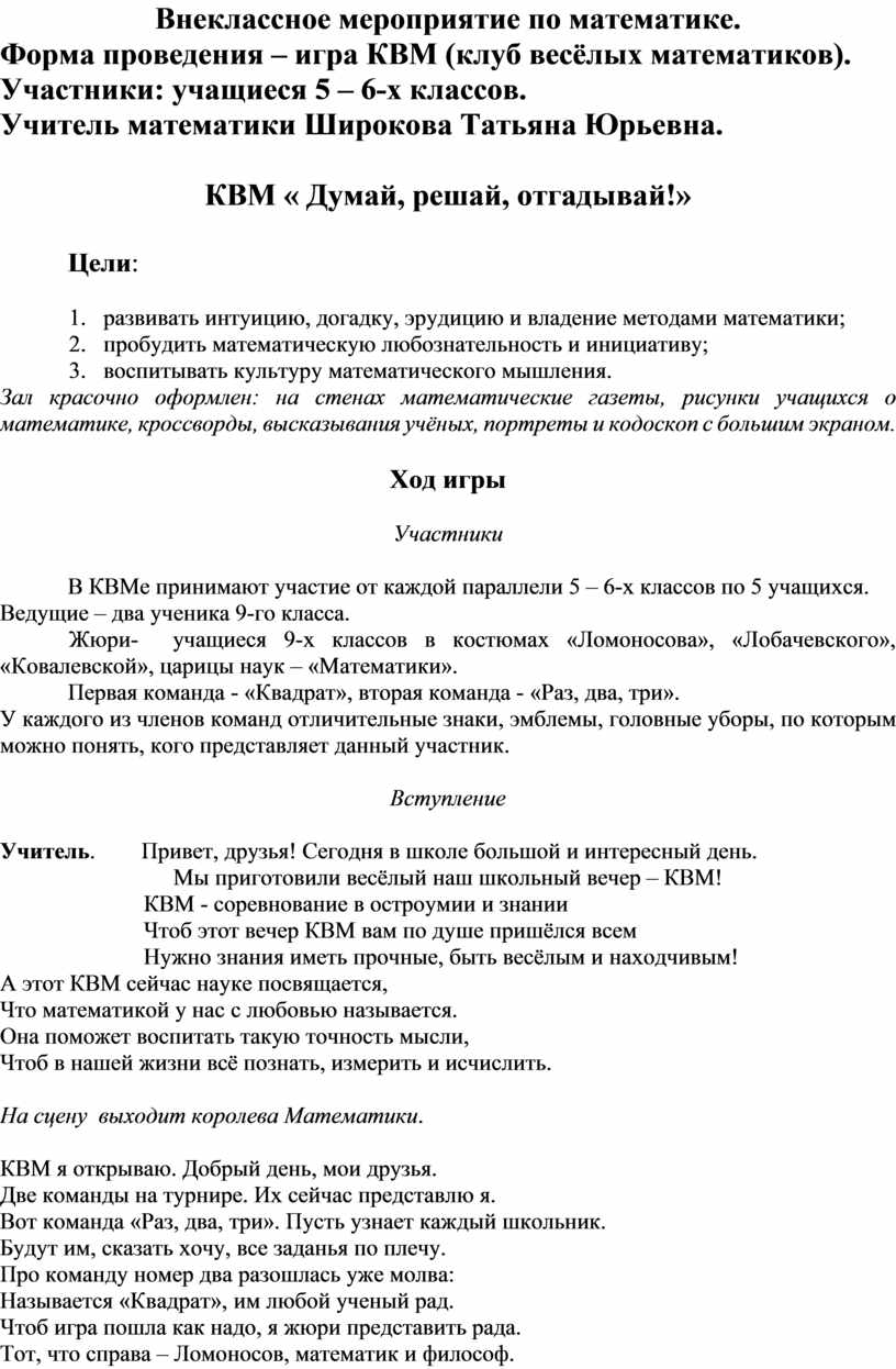 Форма проведения – игра КВМ (клуб весёлых математиков).