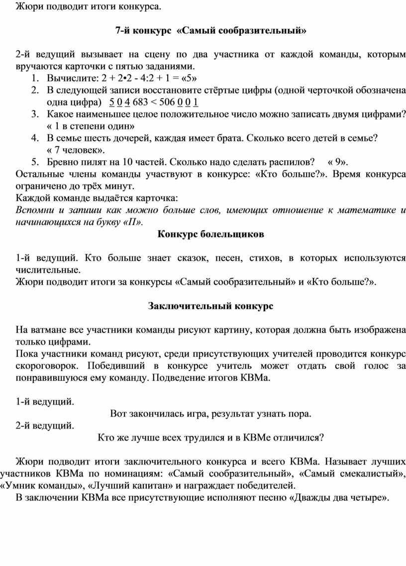 Жюри подводит итоги заключительного конкурса и всего КВМа. Называет лучших участников КВМа по номинациям: «Самый сообразительный», «Самый смекалистый», «Умник команды», «Лучший капитан» и награждает победителей.