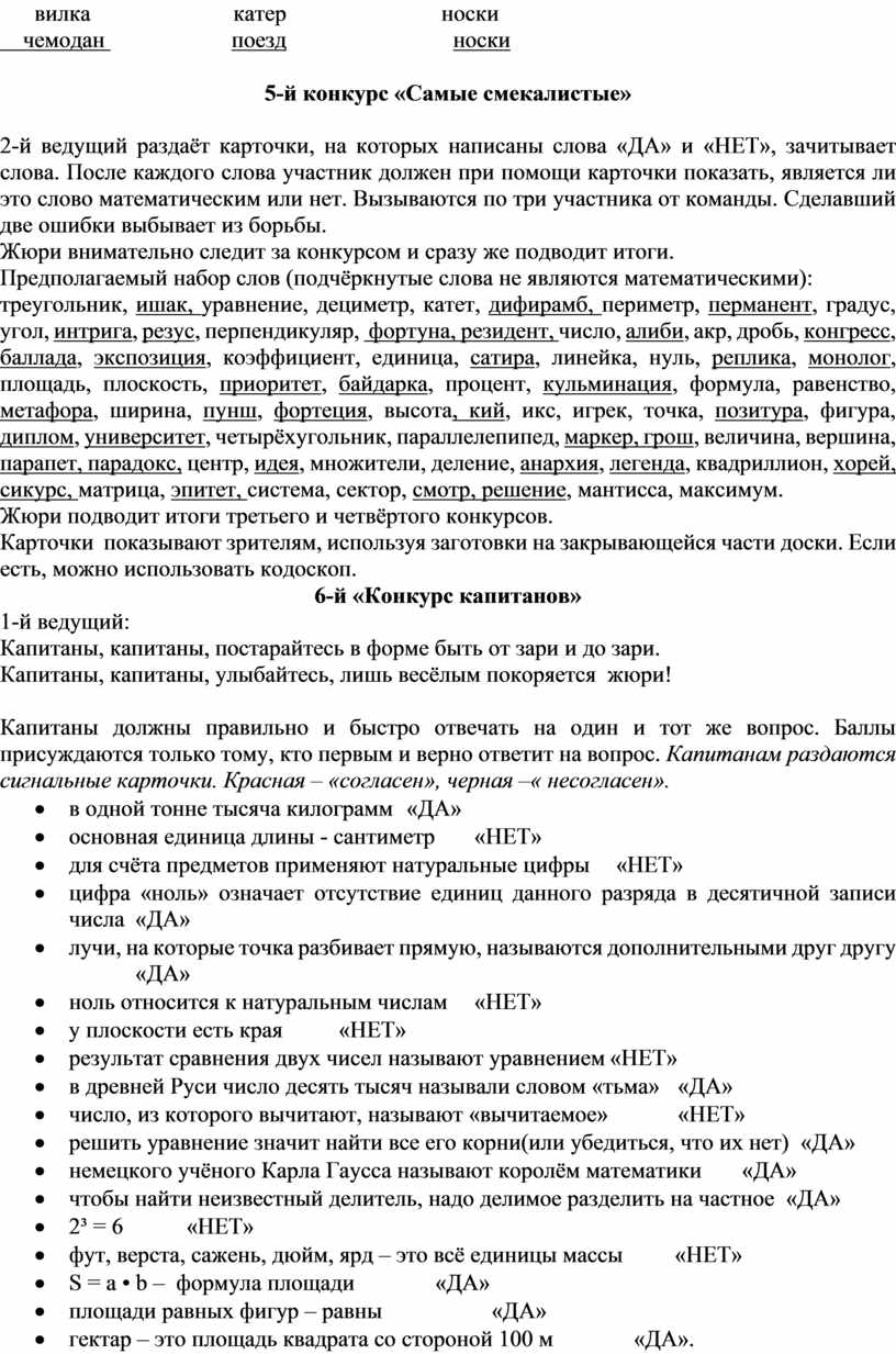 2-й ведущий раздаёт карточки, на которых написаны слова «ДА» и «НЕТ», зачитывает слова. После каждого слова участник должен при помощи карточки показать, является ли это слово математическим или нет. Вызываются по три участника от команды. Сделавший две ошибки выбывает из борьбы.