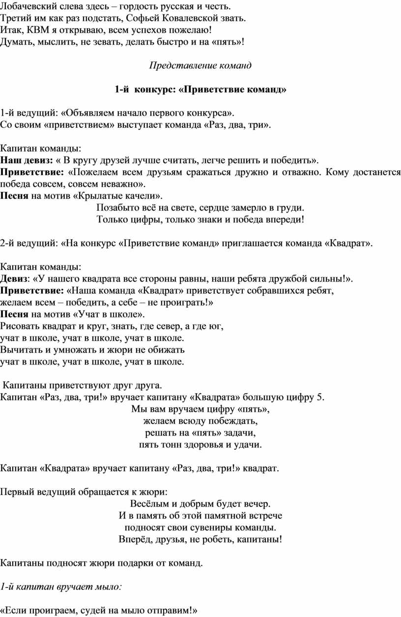 2-й ведущий: «На конкурс «Приветствие команд» приглашается команда «Квадрат».