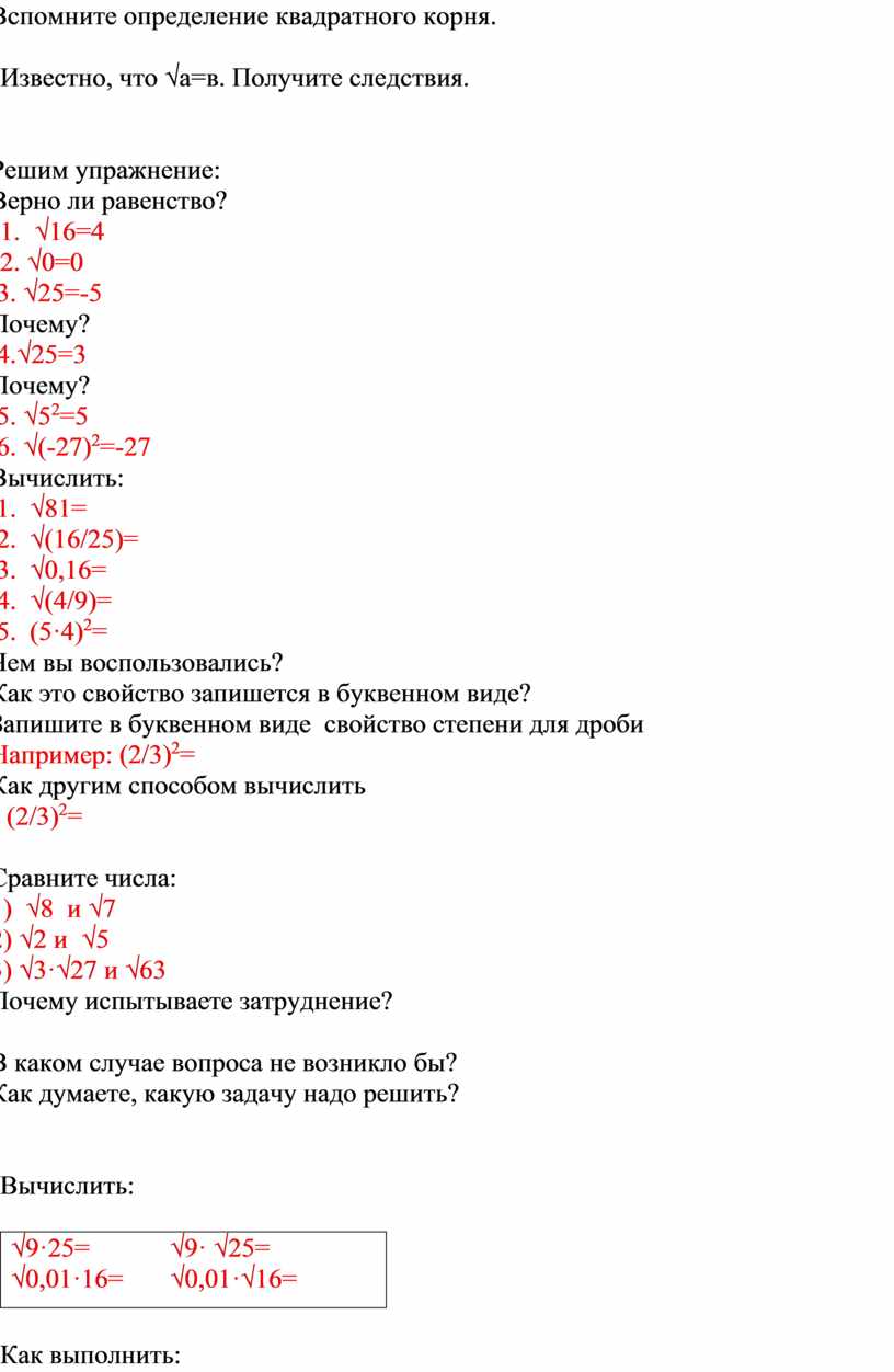 Решим упражнение: Верно ли равенство? 1. √16=4 2. √0=0 3. √25=-5 Почему? 4.√25=3 Почему? 5. √52=5 6. √(-27)2=-27 Вычислить: 1. √81= 2. √(16/25)= 3. √0,16= 4. √(4/9)= 5. (5·4)2= Чем вы воспользовались? Как это свойство запишется в буквенном виде? Запишите в буквенном виде свойство степени для дроби Например: (2/3)2= Как другим способом вычислить (2/3)2=