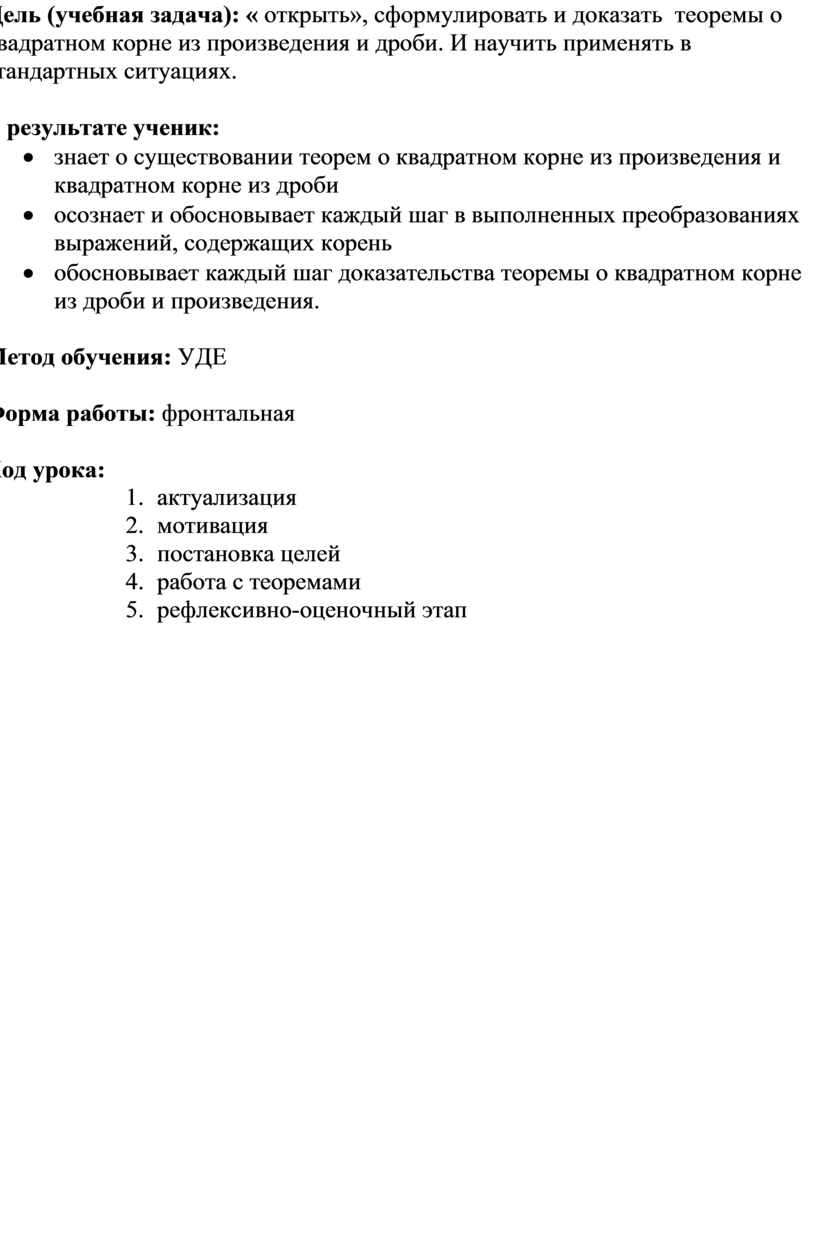 Цель (учебная задача): « открыть», сформулировать и доказать теоремы о квадратном корне из произведения и дроби. И научить применять в стандартных ситуациях.