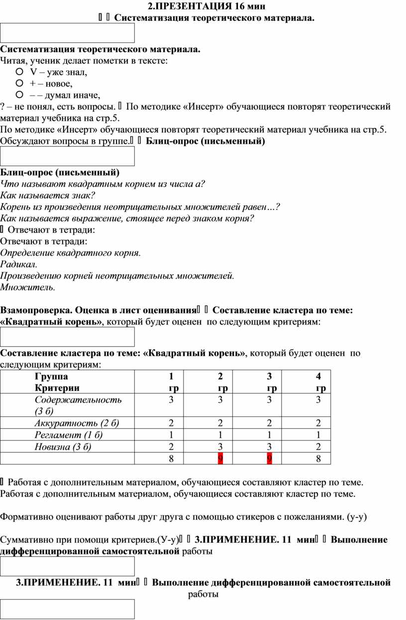 Составление кластера по теме: «Квадратный корень», который будет оценен по следующим критериям: