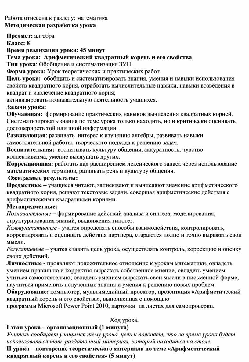 Урок в 8 классе по теме: «Арифметический квадратный корень и его свойства» соответствует программе, учебник А.Е. Абылкасымовой. Это урок обобщения и систематизации ЗУН. На уроке используются различные методы: актуализация знаний, проблемное обучение, тестовая работа, групповая работа, разноуровневая самостоятельная работа, присутствуют логическая миниатюра. Главными задачами урока является формирование практических навыков вычисления квадратных корней, систематизация знаний, развитие интереса к изучению алгебры, навыков самостоятельной работы, творческого подхода к решению задач, работать над расширением лексического запаса через использование математических терминов, развивать речь и культуру общения, воспитывать культуру общения, аккуратность, чувство коллективизма, умение выслушать других.