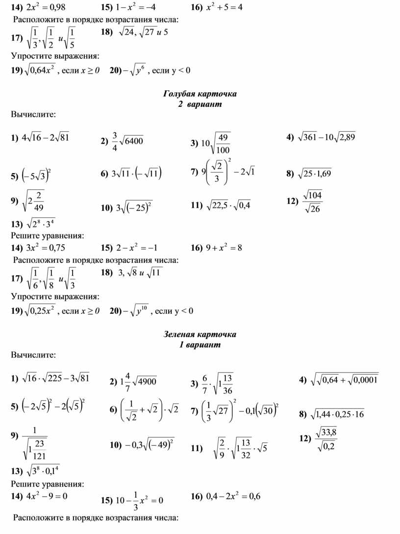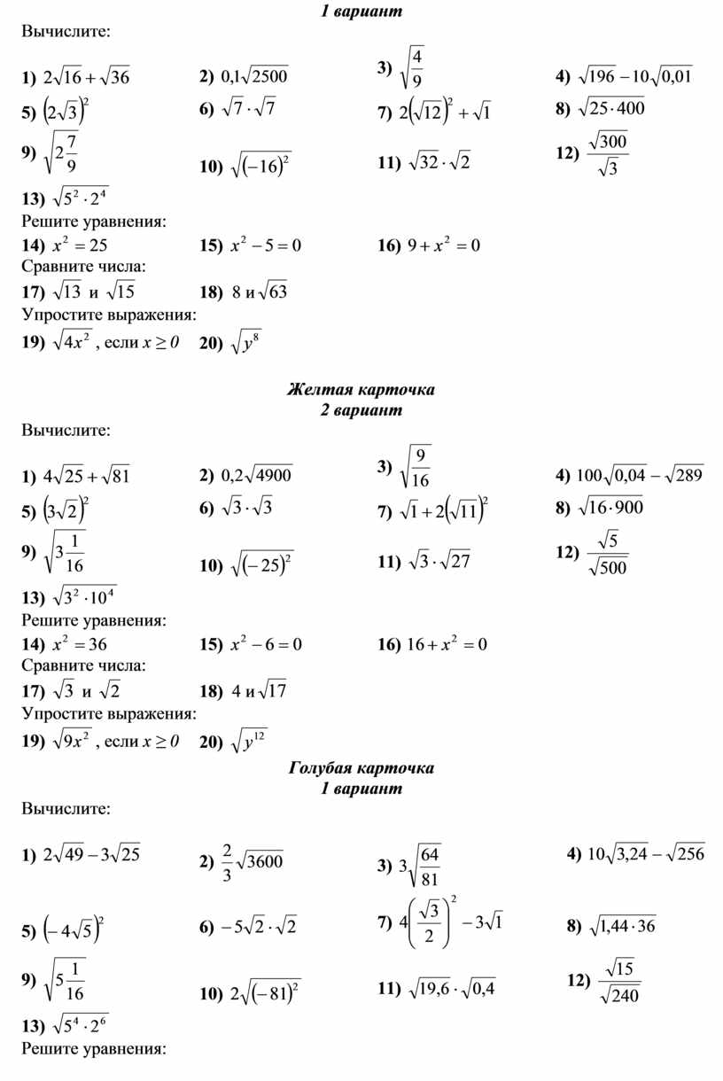равно значение выражения Имеет ли уравнение Сформулируйте свойства арифметического квадратного корня (если а ≥ 0, b ≥ 0, то (если а ≥ 0, b > 0, то При любом значении х верно