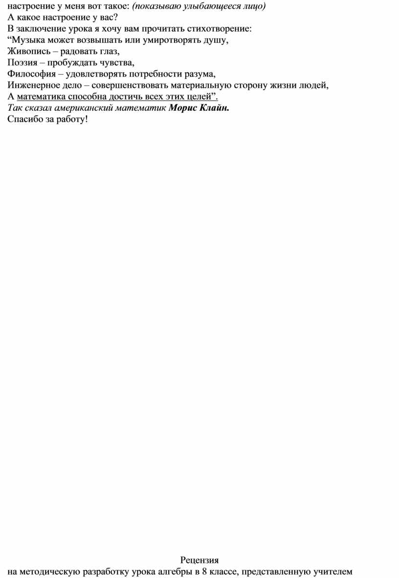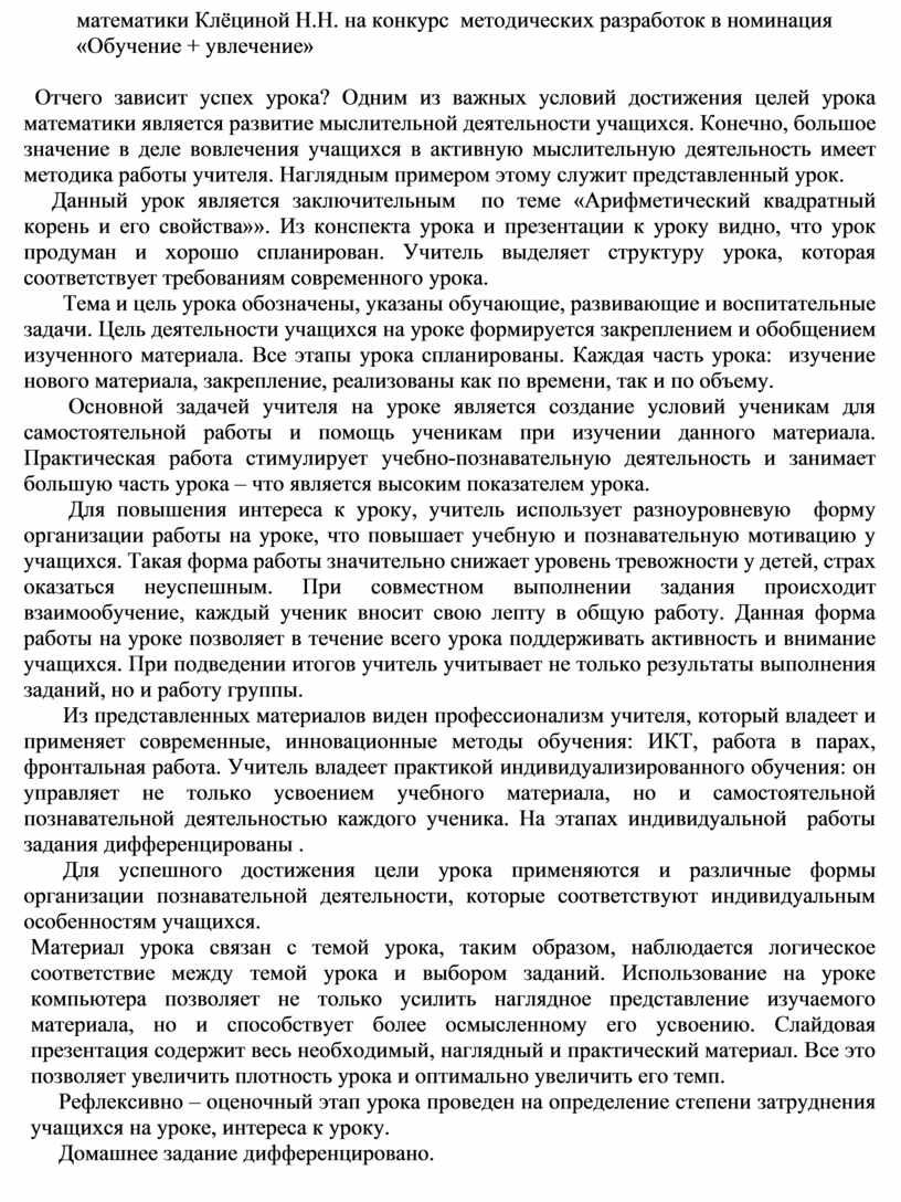 Рецензия на методическую разработку урока алгебры в 8 классе, представленную учителем математики Клёциной Н.Н. на конкурс методических разработок в номинация «Обучение + увлечение»