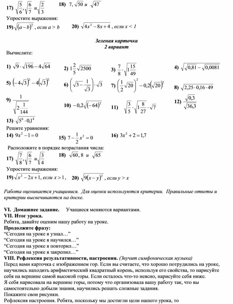 VI. Домашнее задание. Учащиеся меняются вариантами. VII. Итог урока. Ребята, давайте оценим нашу работу на уроке. Продолжите фразу: “Сегодня на уроке я узнал…” “Сегодня на уроке я научился…” “Сегодня на уроке я повторил…” “Сегодня на уроке я закрепил…” VIII. Рефлексия результативности, настроения. (Звучит симфоническая музыка) Перед вами карточка с изображением гор. Если вы считаете, что хорошо потрудились на уроке, научились находить арифметический квадратный корень, используя его свойства, то нарисуйте себя на вершине самой высокой горы. Если осталось что-то неясно, нарисуйте себя ниже. Я себя нарисовала на вершине горы, потому что организовала вашу работу так, что вы самостоятельно добыли знания, научились решать сложные задания. Покажите свои рисунки. Рефлексия настроения. Ребята, поскольку мы достигли цели нашего урока, то настроение у меня вот такое: (показываю улыбающееся лицо) А какое настроение у вас? В заключение урока я хочу вам прочитать стихотворение: “Музыка может возвышать или