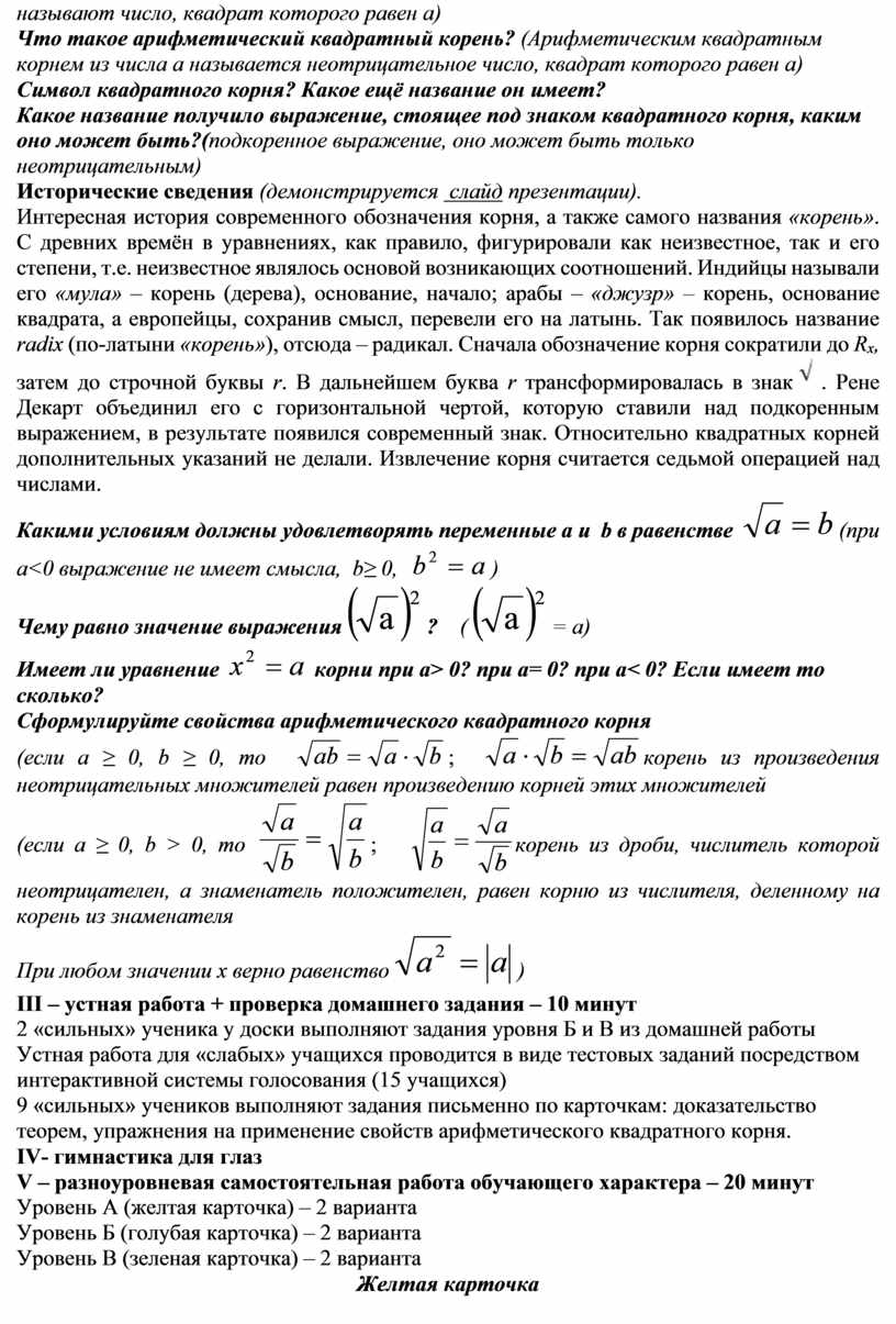 Ход урока. I этап урока – организационный (1 минута) Учитель сообщает учащимся тему урока, цель и поясняет, что во время урока будет использоваться тот раздаточный материал, который находится на столе. II урока – повторение теоретического материала по теме «Арифметический квадратный корень и его свойства» (5 минут) Учитель: Что называется квадратным корнем? (Квадратным корнем из числа а называют число, квадрат которого равен а) Что такое арифметический квадратный корень? (Арифметическим квадратным корнем из числа а называется неотрицательное число, квадрат которого равен а) Символ квадратного корня? Какое ещё название он имеет? Какое название получило выражение, стоящее под знаком квадратного корня, каким оно может быть?(подкоренное выражение, оно может быть только неотрицательным) Исторические сведения (демонстрируется слайд презентации). Интересная