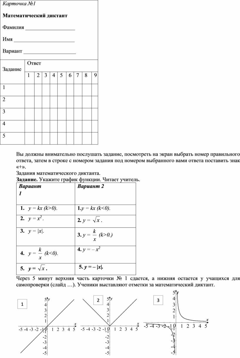 Карточка №1 Математический диктант Фамилия __________________ Имя ______________________ Вариант ___________________ |