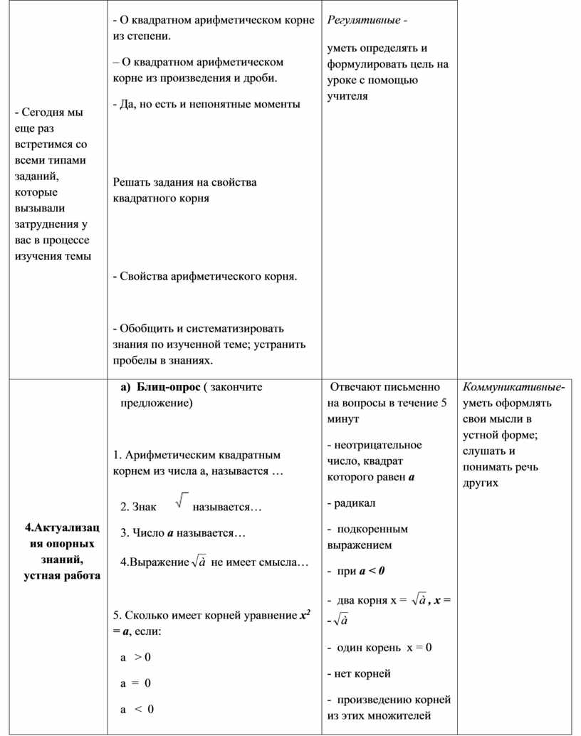 Цели урока: Систематизировать знания по теме «Свойства арифметического квадратного корня», организовать деятельность учащихся по обобщению и систематизации знаний в рамках изученной темы, обеспечить применение учащимися знаний и способов действий в разнообразных ситуациях
