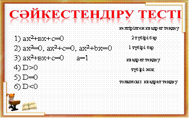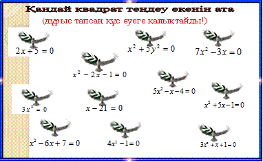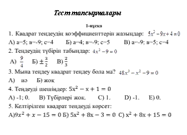 Квадрат теңдеудің түбірлерін табу формулаларын түсіндіре отырып есептер шығара білуге меңгерту. |