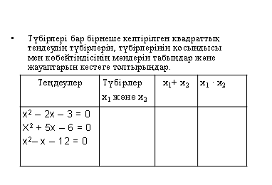 Квадрат теңдеудің түбірлерінің формулаларына есептер шығару. |
