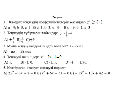 Барлығы: Квадрат теңдеудің үш түріне де есептер шығара білу керек. Көбі: Квадрат теңдеу түбірлерінің формулаларын, дискриминант, түбір табу формулаларын жаза білу керек. Кейбірі:деңгейлік тапсырма есептерін шығара білу керек |