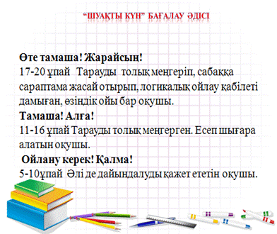 Есеп шығарудың тиімді жолдарын үйренеді, топпен жұмыс істейді. Есептердің шығарылу жолдарын бір – біріне түсіндіреді, өзгенің қатесін түзейді. Оқушылар жекелеме,жұппен,топпен жұмыс істей отырып идея бөліседі, өнім жасалады, талдайды,жинақтайды, қорытындылайды, бағалайды. |