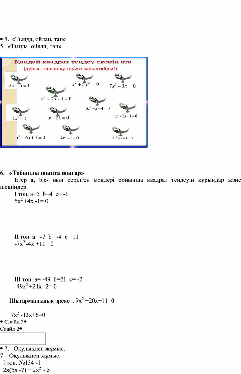 6. «Тобыңды шыңға шығар» Егер a, b,c- ның берілген мәндері бойынша квадрат теңдеуін құрыңдар және шешіңдер. І топ. a=5 b=4 c= -1 5x2 +4x -1= 0