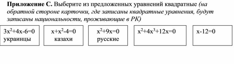 Приложение С. Выберите из предложенных уравнений квадратные (на обратной стороне карточки, где записаны квадратные уравнения, будут записаны национальности, проживающие в РК)