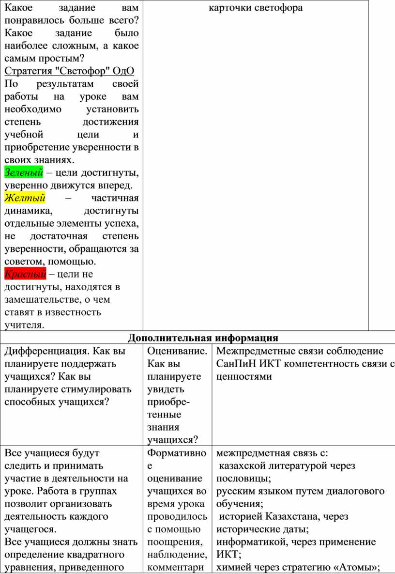 Формативное оценивание учащихся во время урока проводилось с помощью поощрения, наблюдение, комментарий, уточняющих вопросов, страте-гии «Большой палец» «Светофор». Суммативное оценивание выставляется после завершения заданий. |
