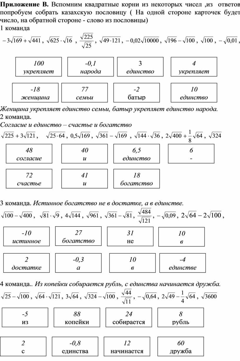 Приложение В. Вспомним квадратные корни из некоторых чисел ,из ответов попробуем собрать казахскую пословицу ( На одной стороне карточек будет число, на обратной стороне - слово из пословицы)