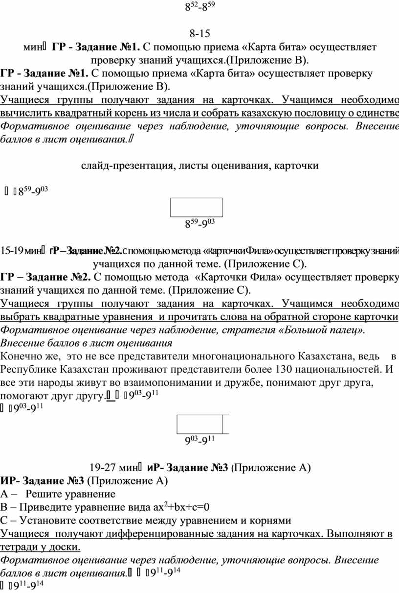 ГР – Задание №2. С помощью метода «Карточки Фила» осуществляет проверку знаний учащихся по данной теме. (Приложение С). Учащиеся группы получают задания на карточках. Учащимся необходимо выбрать квадратные уравнения и прочитать слова на обратной стороне карточки Формативное оценивание через наблюдение, стратегия «Большой палец». Внесение баллов в лист оценивания Конечно же, это не все представители многонационального Казахстана, ведь в Республике Казахстан проживают представители более 130 национальностей. И все эти народы живут во взаимопонимании и дружбе, понимают друг друга, помогают друг другу. |