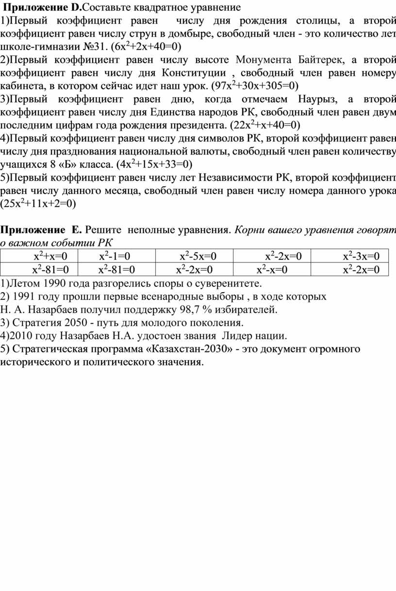 Приложение Е. Решите неполные уравнения. Корни вашего уравнения говорят о важном событии РК