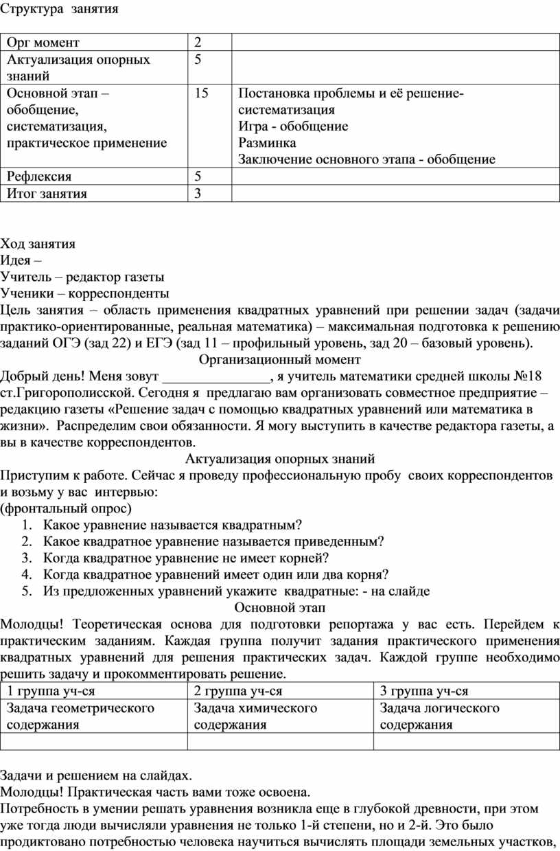 Добрый день! Меня зовут _______________, я учитель математики средней школы №18 ст.Григорополисской. Сегодня я предлагаю вам организовать совместное предприятие – редакцию газеты «Решение задач с помощью квадратных уравнений или математика в жизни». Распределим свои обязанности. Я могу выступить в качестве редактора газеты, а вы в качестве корреспондентов.