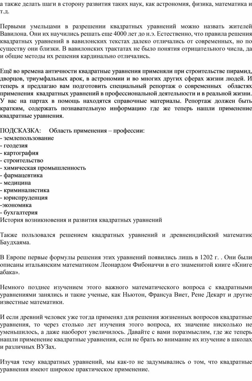 Ещё во времена античности квадратные уравнения применяли при строительстве пирамид, дворцов, триумфальных арок, в астрономии и во многих других сферах жизни людей. И теперь я предлагаю вам подготовить специальный репортаж о современных областях применения квадратных уравнений в профессиональной деятельности и в реальной жизни. У вас на партах в помощь находятся справочные материалы. Репортаж должен быть кратким, содержать познавательную информацию где же теперь нашли применение квадратные уравнения.