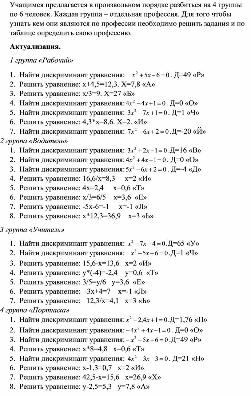 Учащимся предлагается в произвольном порядке разбиться на 4 группы по 6 человек. Каждая группа – отдельная профессия. Для того чтобы узнать кем они являются по профессии необходимо решить задания и по таблице определить свою профессию.