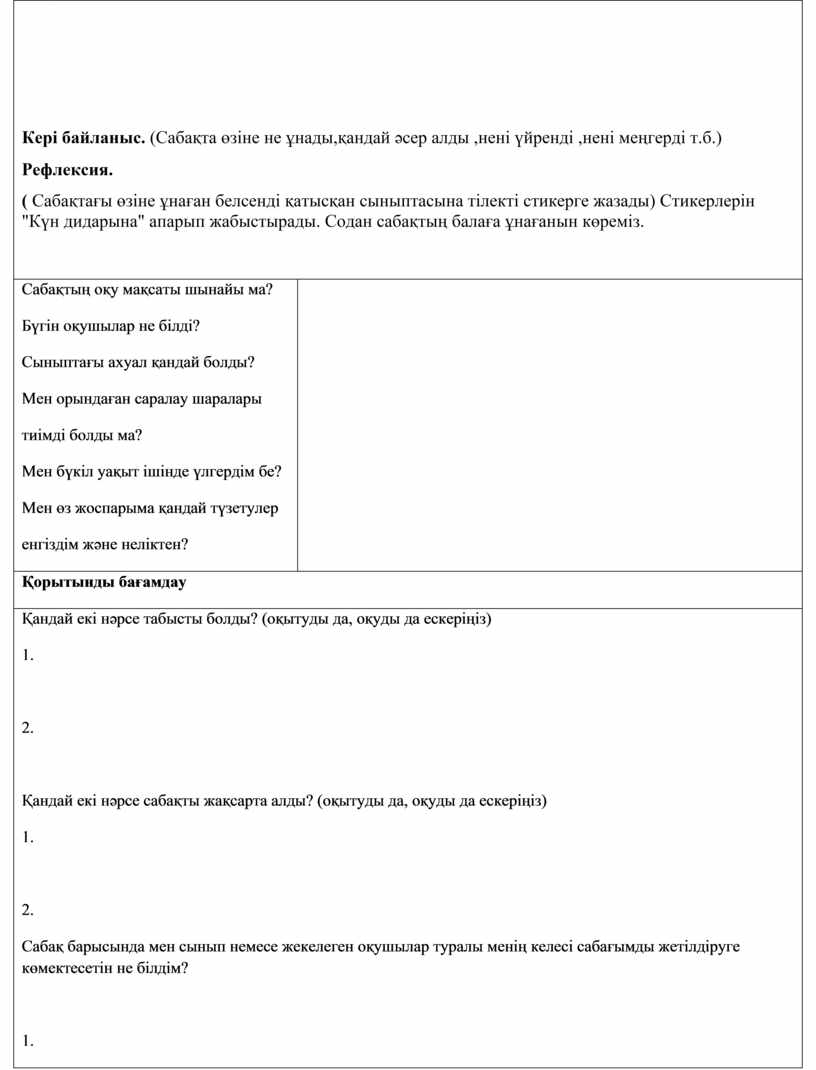 Сабақтың оқу мақсаты шынайы ма? Бүгін оқушылар не білді? Сыныптағы ахуал қандай болды? Мен орындаған саралау шаралары тиімді болды ма? Мен бүкіл уақыт ішінде үлгердім бе? Мен өз жоспарыма қандай түзетулер енгіздім және неліктен? |