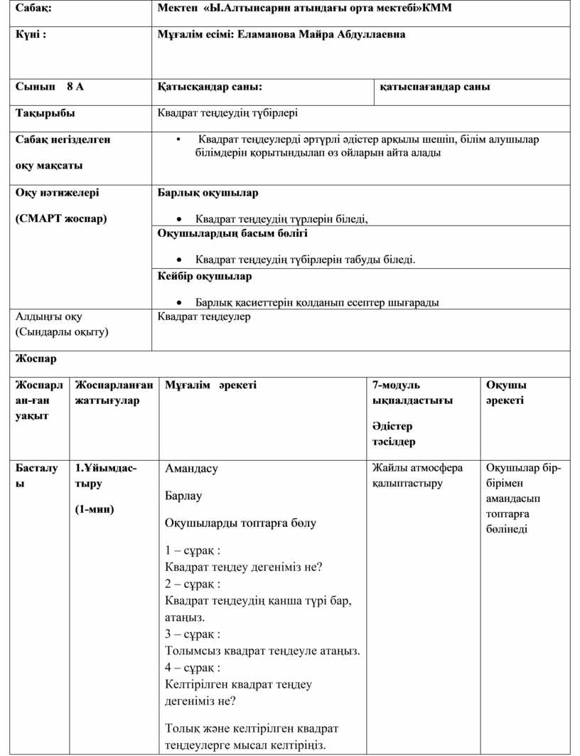 • Квадрат теңдеулерді әртүрлі әдістер арқылы шешіп, білім алушылар білімдерін қорытындылап өз ойларын айта алады