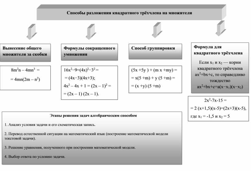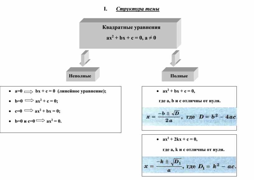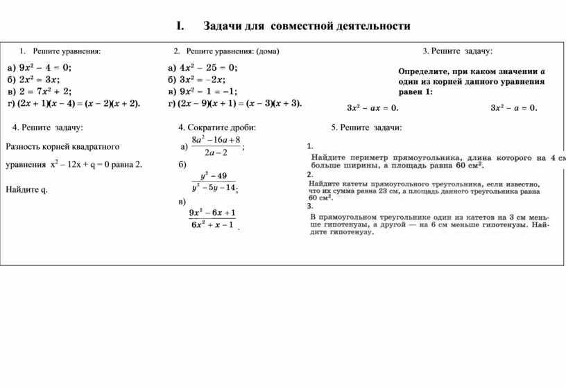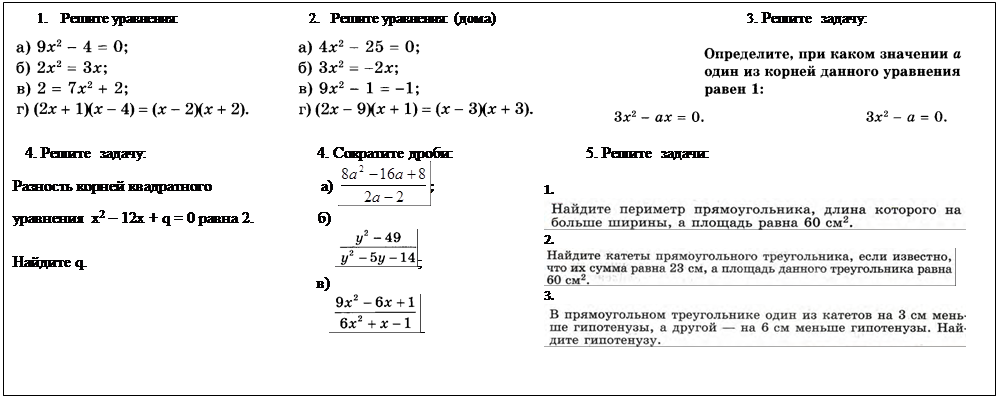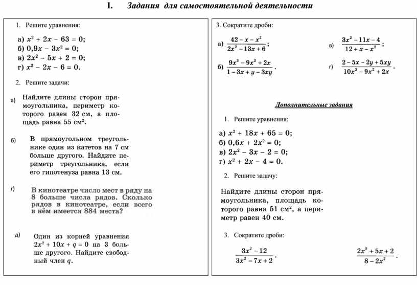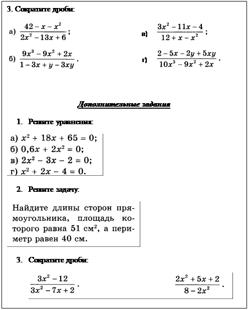 Неполные квадратные уравнения. Решение квадратных уравнений по формуле. Теорема Виета. Разложение квадратного трёхчлена на множители. Сокращение дробей. Решение задач с помощью квадратных уравнений. |