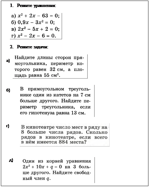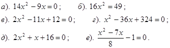 1). Решите уравнение: а). 2х2+7х – 9 = 0; б). 3х2 = 18х; в). 100 х2 – 16 = 0; г). х2 – 16х + 63 = 0.