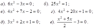 1). Решите уравнение: а). 3х2+13х – 10 = 0; б). 2х2 – 3х = 0; в). 16 х2 = 49; г). х2 – 2х – 35 = 0.