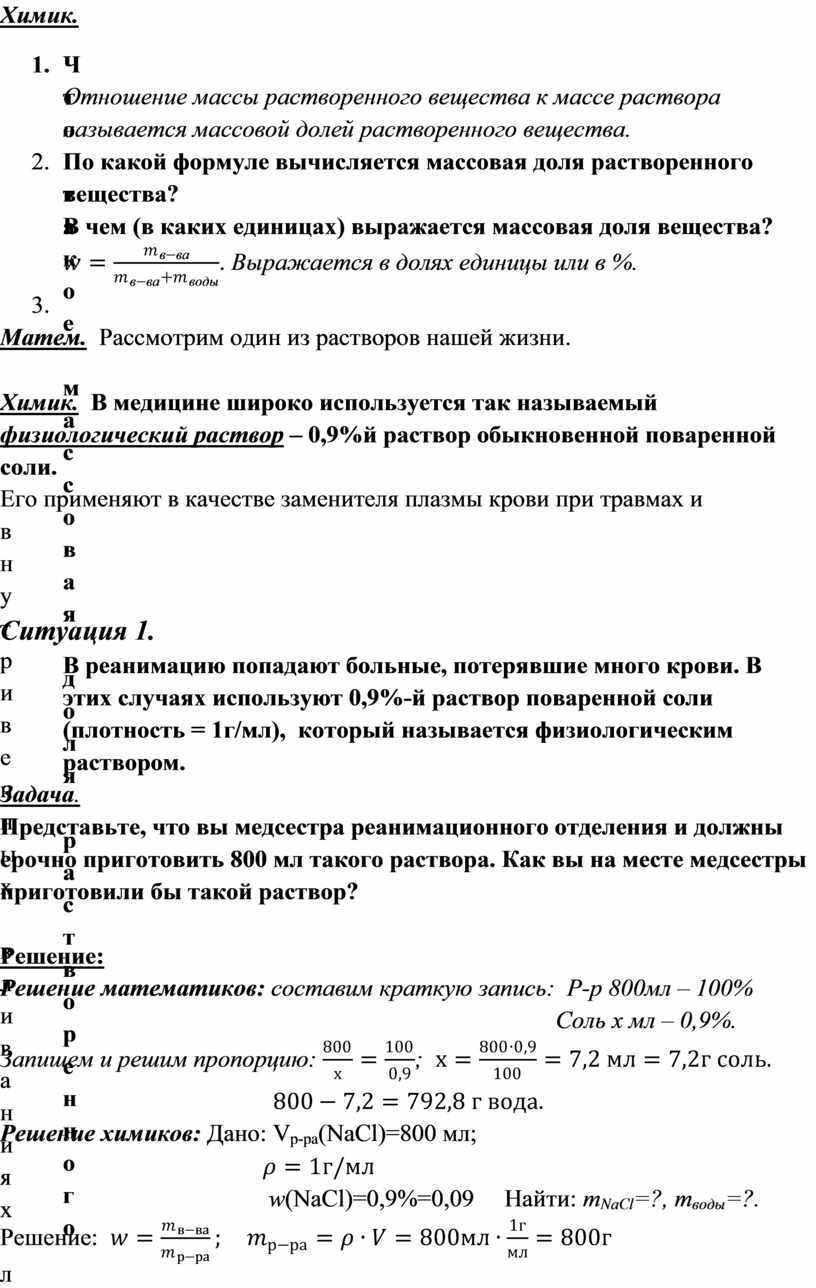 В реанимацию попадают больные, потерявшие много крови. В этих случаях используют 0,9%-й раствор поваренной соли (плотность = 1г/мл), который называется физиологическим раствором.