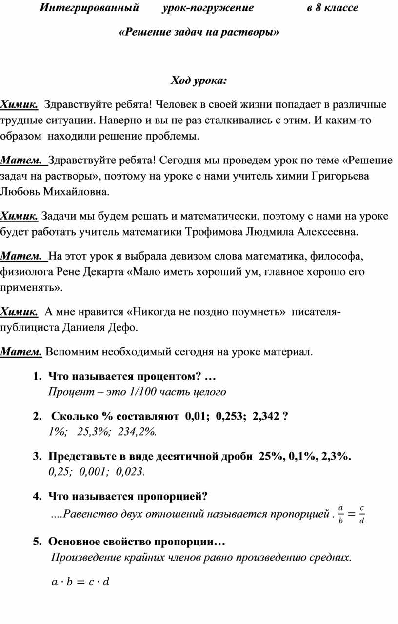 Химик. Задачи мы будем решать и математически, поэтому с нами на уроке будет работать учитель математики Трофимова Людмила Алексеевна.