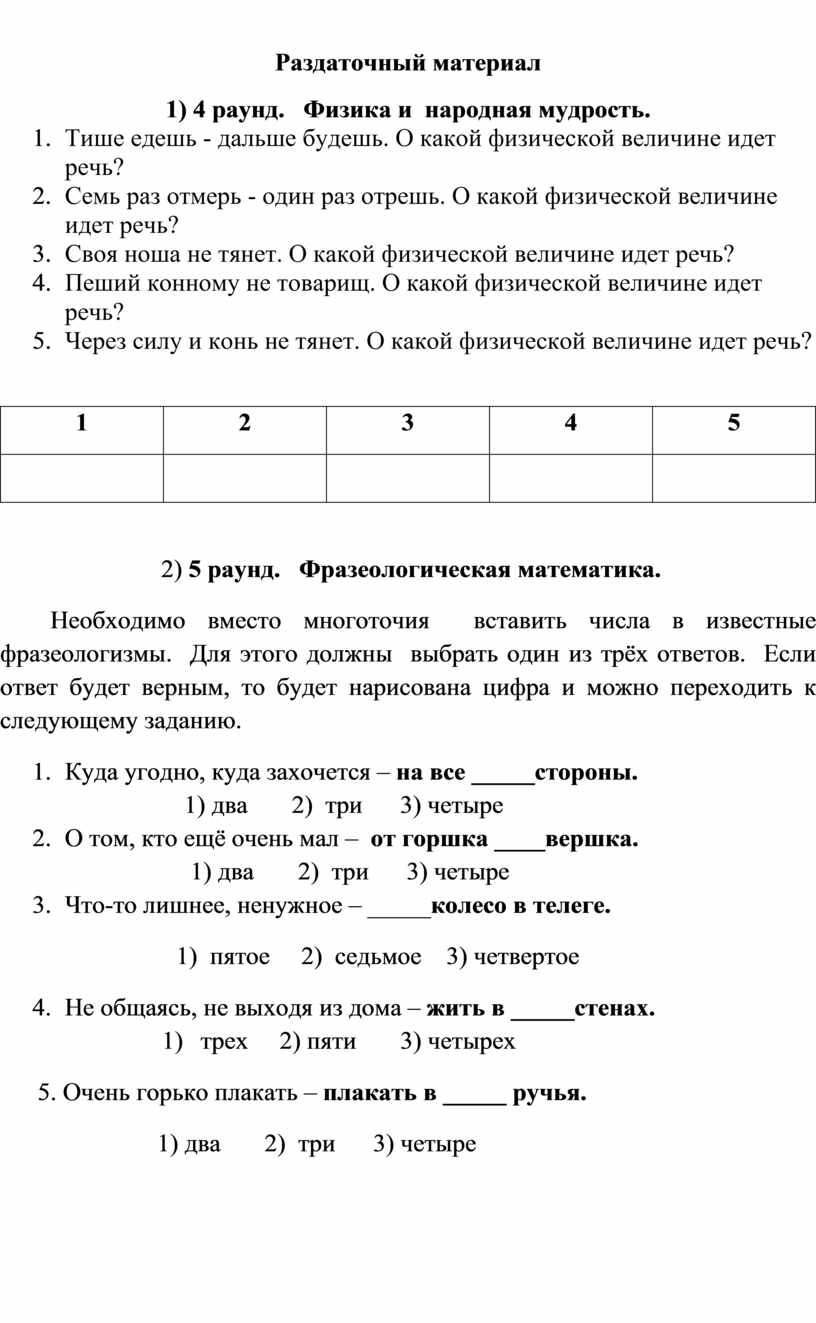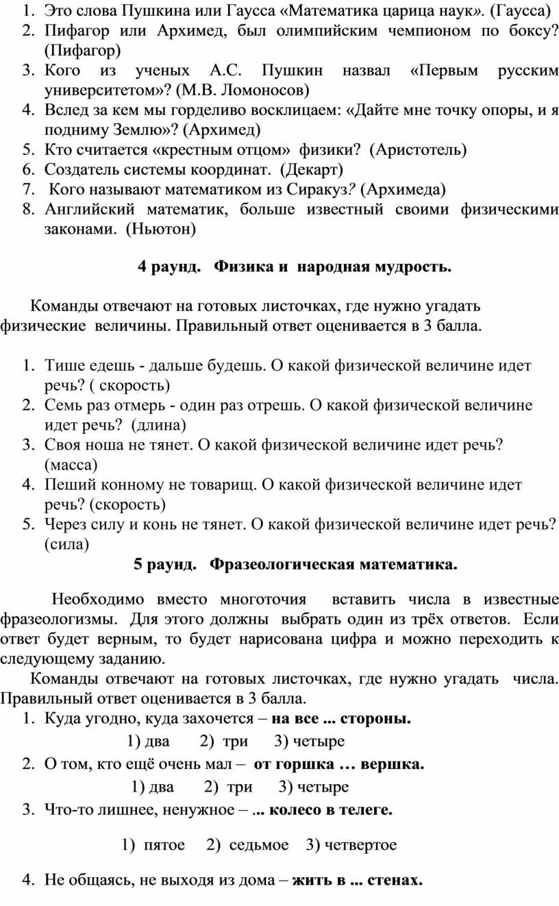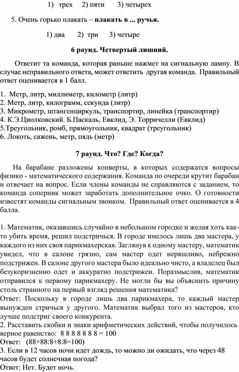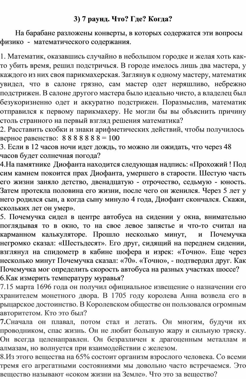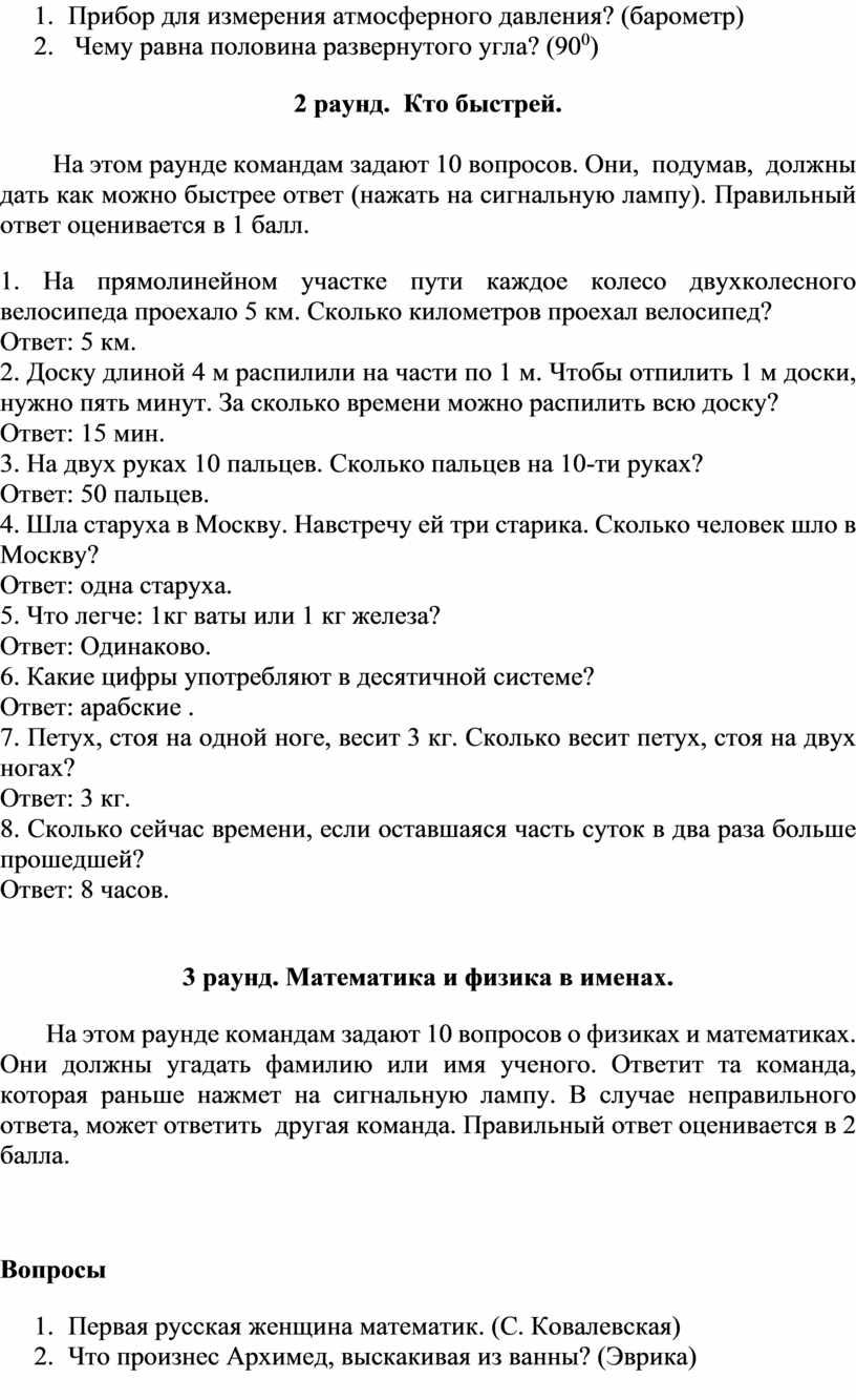 На барабане разложены конверты, в которых содержатся вопросы физико - математического содержания. Команда по очереди крутит барабан и отвечает на вопрос. Если члены команды не справляются с заданием, то команда соперник может заработать дополнительное очко. О готовности известят команды сигнальным звонком. Правильный ответ оценивается в 4 балла.