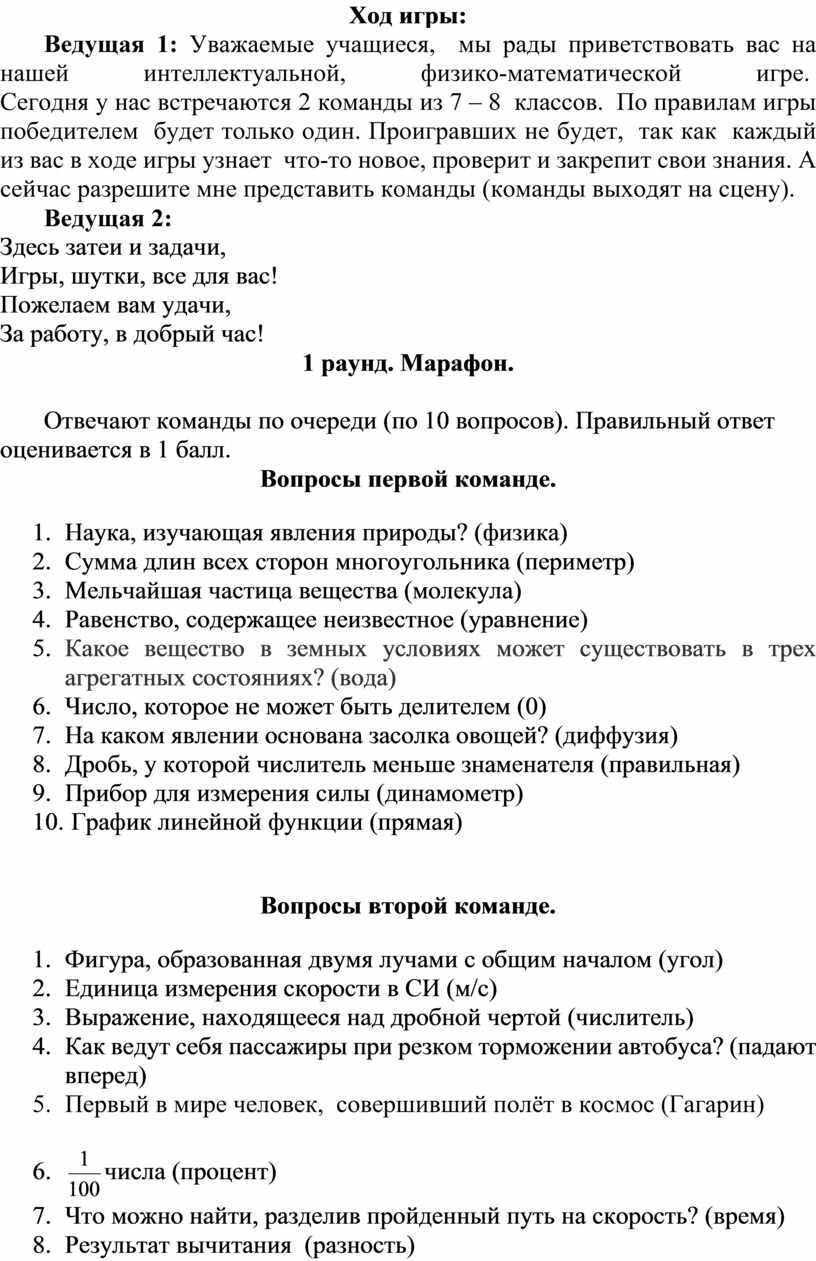 Отвечают команды по очереди (по 10 вопросов). Правильный ответ оценивается в 1 балл.