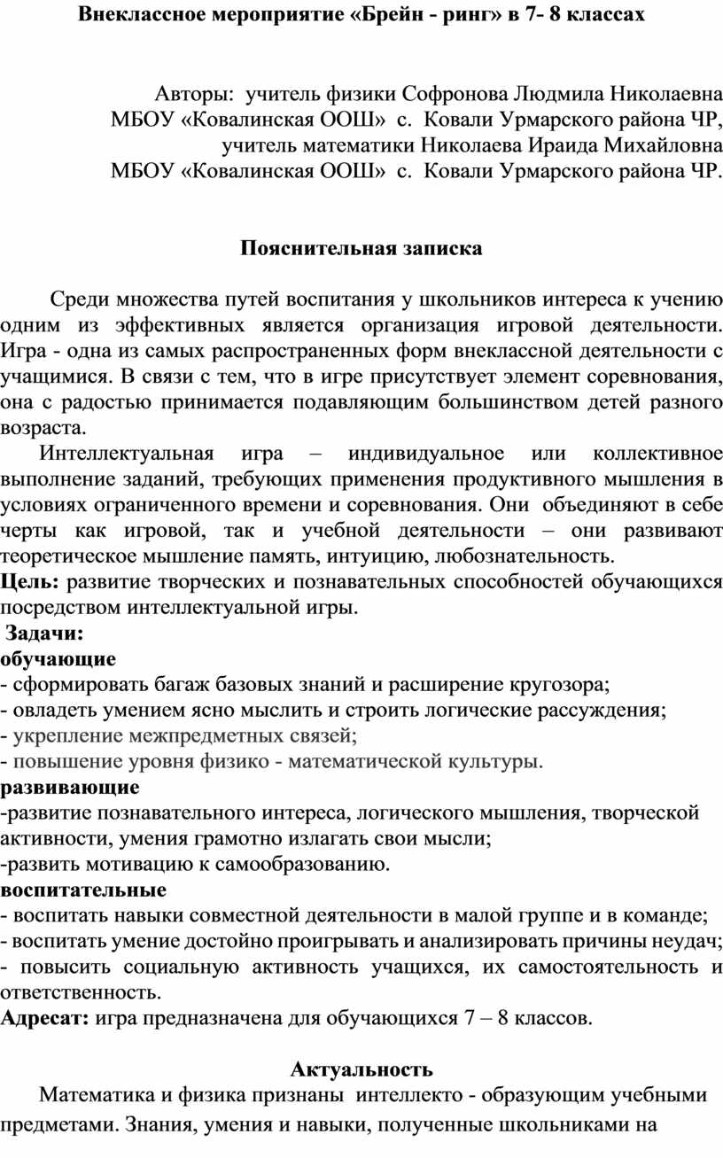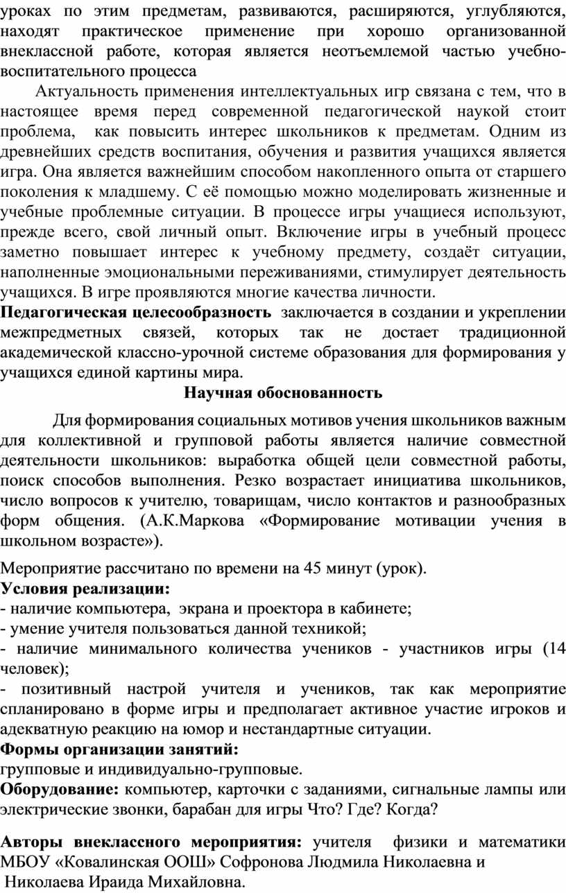Авторы внеклассного мероприятия: учителя физики и математики МБОУ «Ковалинская ООШ» Софронова Людмила Николаевна и
