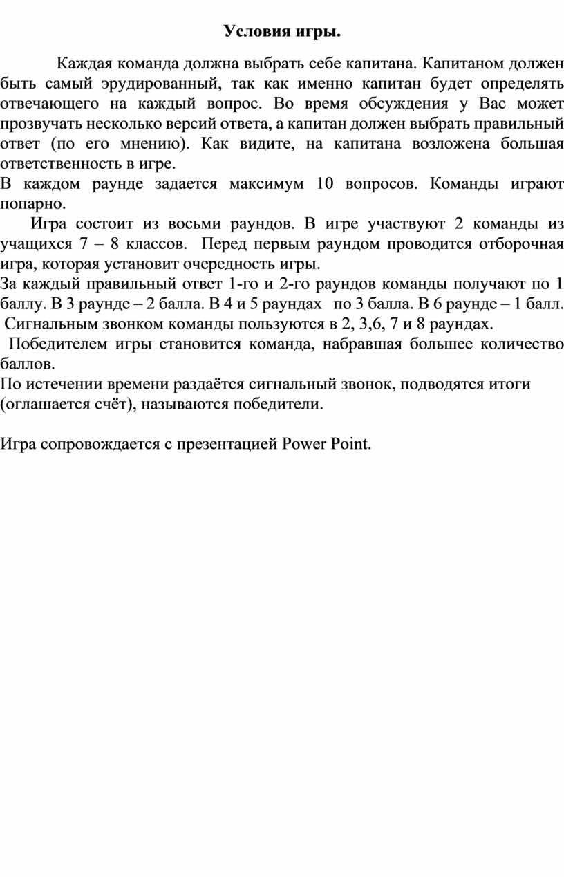 Игра состоит из восьми раундов. В игре участвуют 2 команды из учащихся 7 – 8 классов. Перед первым раундом проводится отборочная игра, которая установит очередность игры.