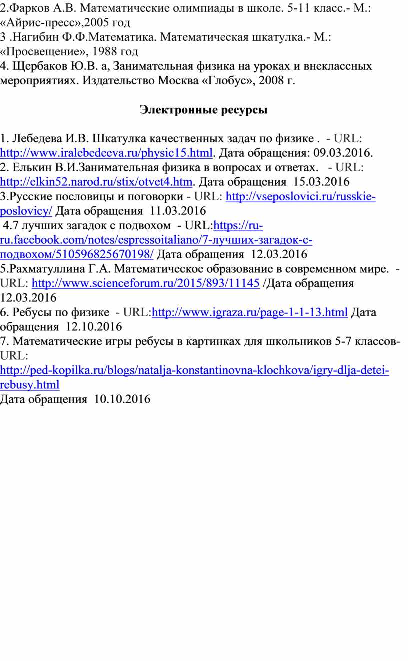 1. Лебедева И.В. Шкатулка качественных задач по физике . - URL: http://www.iralebedeeva.ru/physic15.html. Дата обращения: 09.03.2016.