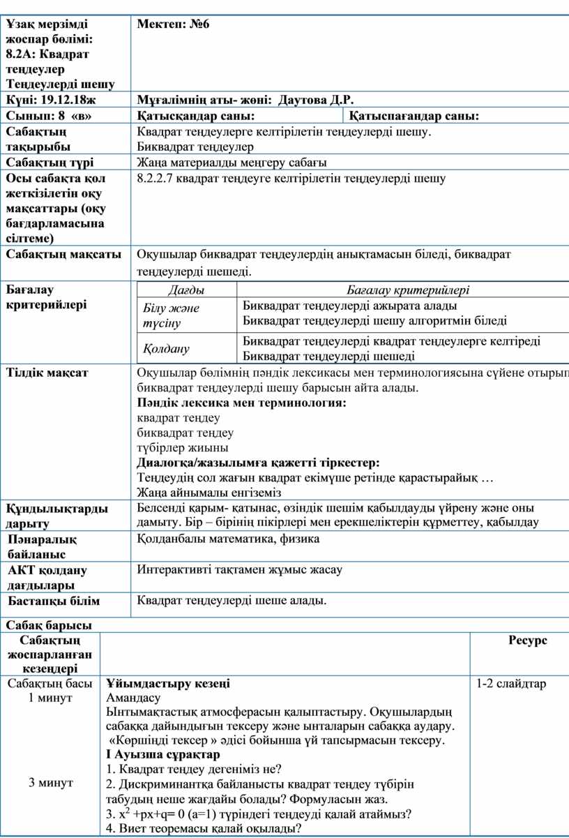 Оқушылар бөлімнің пәндік лексикасы мен терминологиясына сүйене отырып, биквадрат теңдеулерді шешу барысын айта алады. Пәндік лексика мен терминология: квадрат теңдеу биквадрат теңдеу түбірлер жиыны Диалогқа/жазылымға қажетті тіркестер: Теңдеудің сол жағын квадрат екімүше ретінде қарастырайық … Жаңа айнымалы енгіземіз |