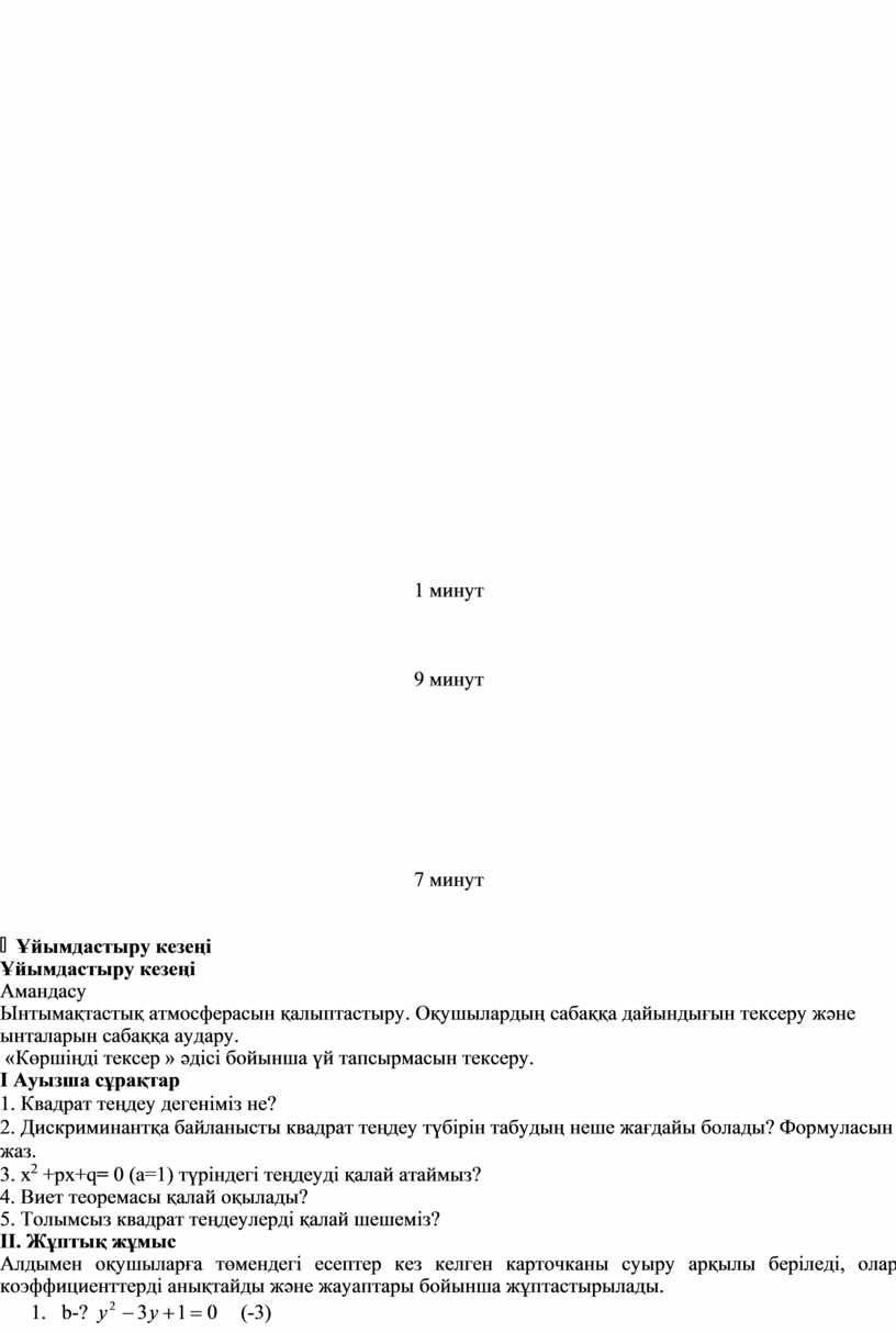 Ұйымдастыру кезеңі Амандасу Ынтымақтастық атмосферасын қалыптастыру. Оқушылардың сабаққа дайындығын тексеру және ынталарын сабаққа аудару. «Көршіңді тексер » әдісі бойынша үй тапсырмасын тексеру. І Ауызша сұрақтар 1. Квадрат теңдеу дегеніміз не? 2. Дискриминантқа байланысты квадрат теңдеу түбірін табудың неше жағдайы болады? Формуласын жаз. 3. х2 +рх+q= 0 (а=1) түріндегі теңдеуді қалай атаймыз? 4. Виет теоремасы қалай оқылады? 5. Толымсыз квадрат теңдеулерді қалай шешеміз? ІІ. Жұптық жұмыс Алдымен оқушыларға төмендегі есептер кез келген карточканы суыру арқылы беріледі, олар коэффициенттерді анықтайды және жауаптары бойынша жұптастырылады. 1. b-?
