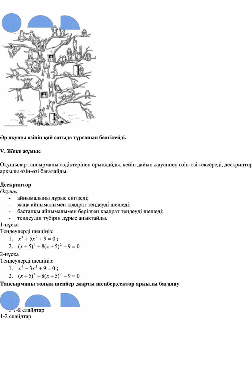 Әр оқушы өзінің қай сатыда тұрғанын белгілейді. V. Жеке жұмыс Оқушылар тапсырманы өздіктерінен орындайды, кейін дайын жауаппен өзін-өзі тексереді, дескриптор арқылы өзін-өзі бағалайды. Дескриптор Оқушы - айнымалыны дұрыс енгізеді; - жаңа айнымалымен квадрат теңдеуді шешеді; - бастапқы айнымалымен берілген квадрат теңдеуді шешеді; - теңдеудің түбірін дұрыс анықтайды. 1-нұсқа Теңдеулерді шешіңіз: 1. 2. 2-нұсқа Теңдеулерді шешіңіз: 1. 2. Тапсырманы толық шеңбер ,жарты шеңбер,сектор арқылы бағалау